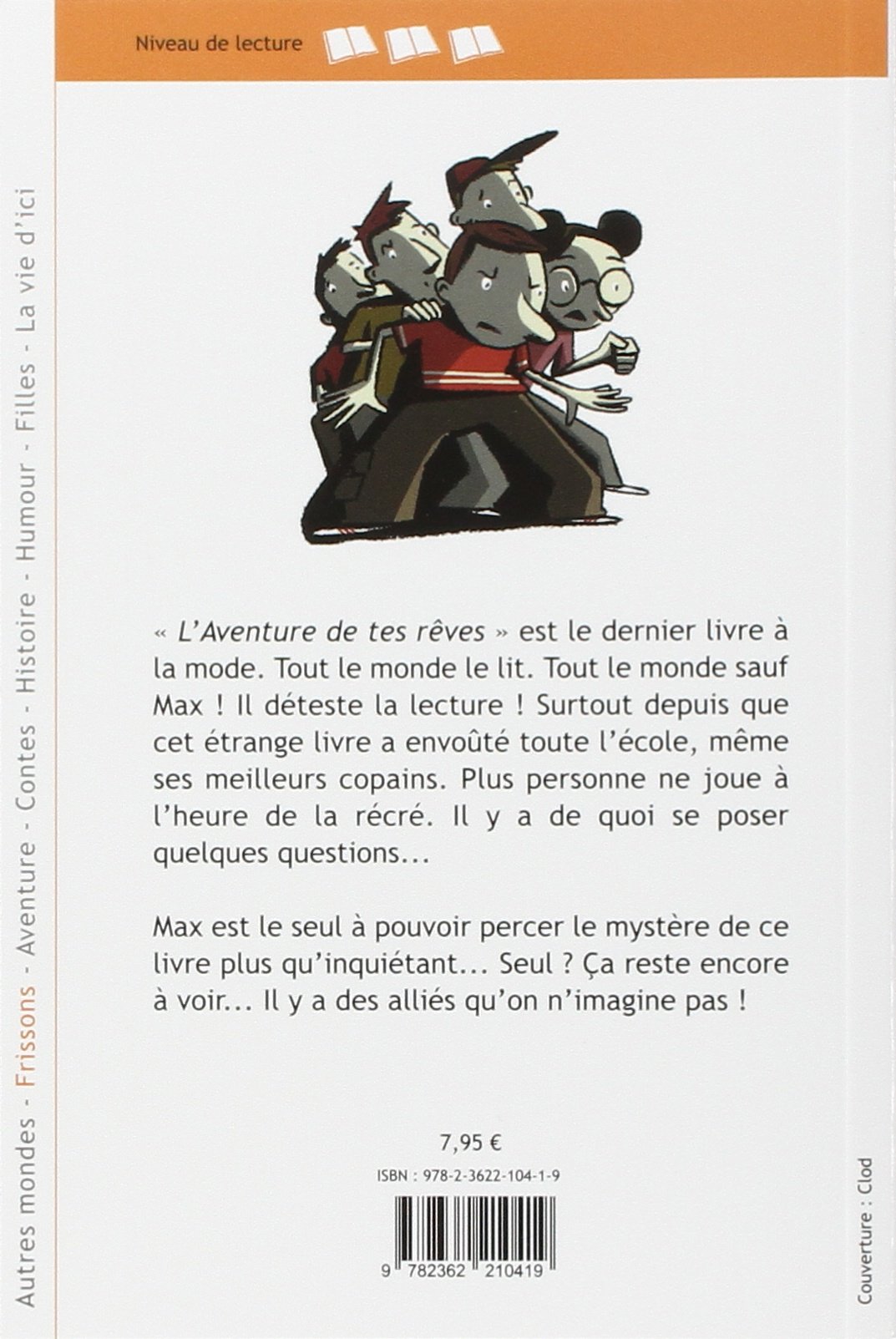 L’aventure de tes rêves est le dernier livre à la mode. Tout le monde le lit. Tout le monde sauf Max ! Il déteste la lecture ! Surtout depuis que cet étrange livre a envoûté toute l’école, même ses meilleurs copains. Plus personne ne joue à l’heure de la récré. Il y a de quoi se poser quelques questions… Max est le seul à pouvoir percer le mystère de ce livre plus qu’inquiétant… Seul ? Ça reste encore à voir… Il y a des alliés qu’on n’imagine pas !